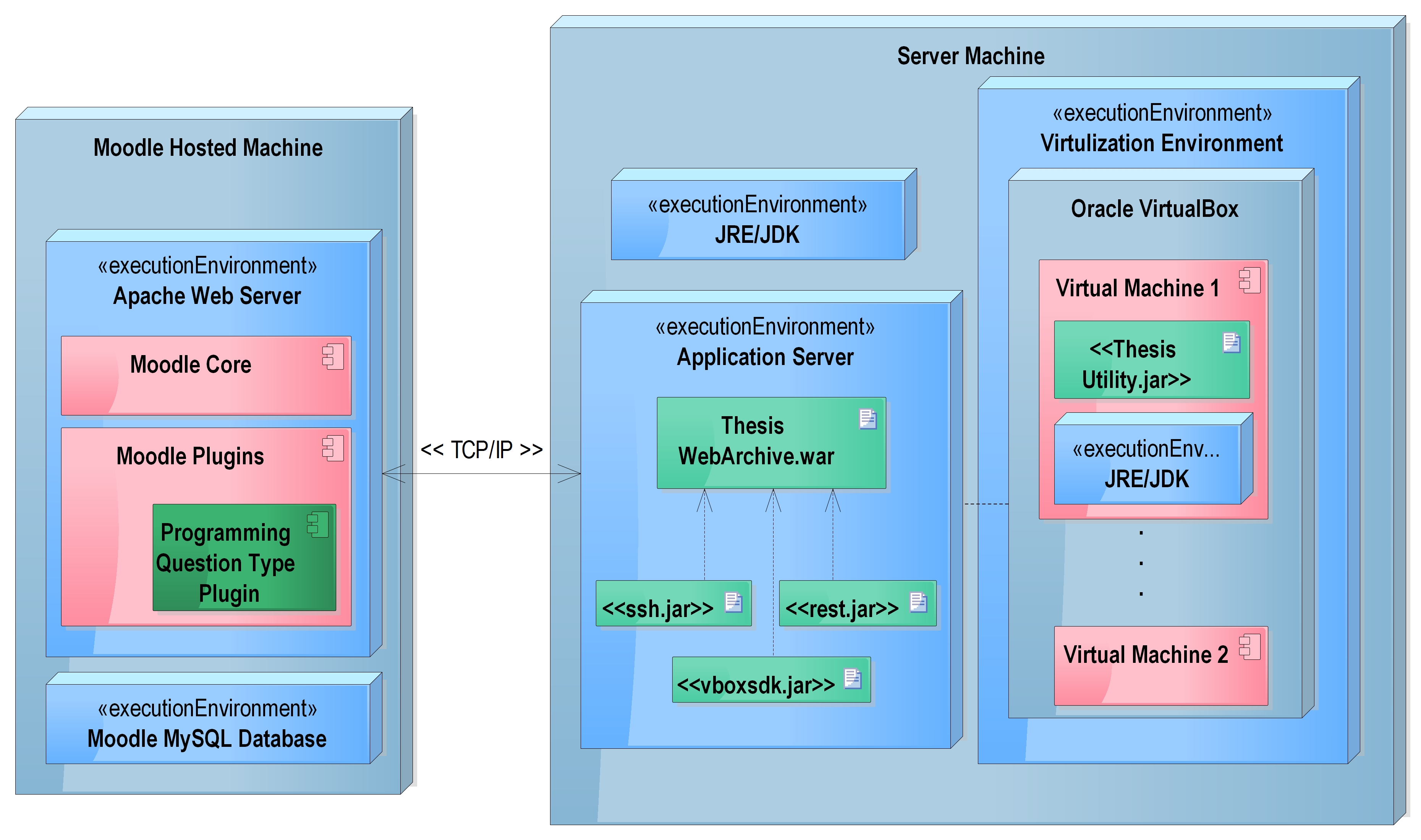 Deployment layout from the thesis — Moodle platform, VirtualBox host running vBoxWebSrv, and isolated SliTaz Linux VMs as separate machines on the same intranet