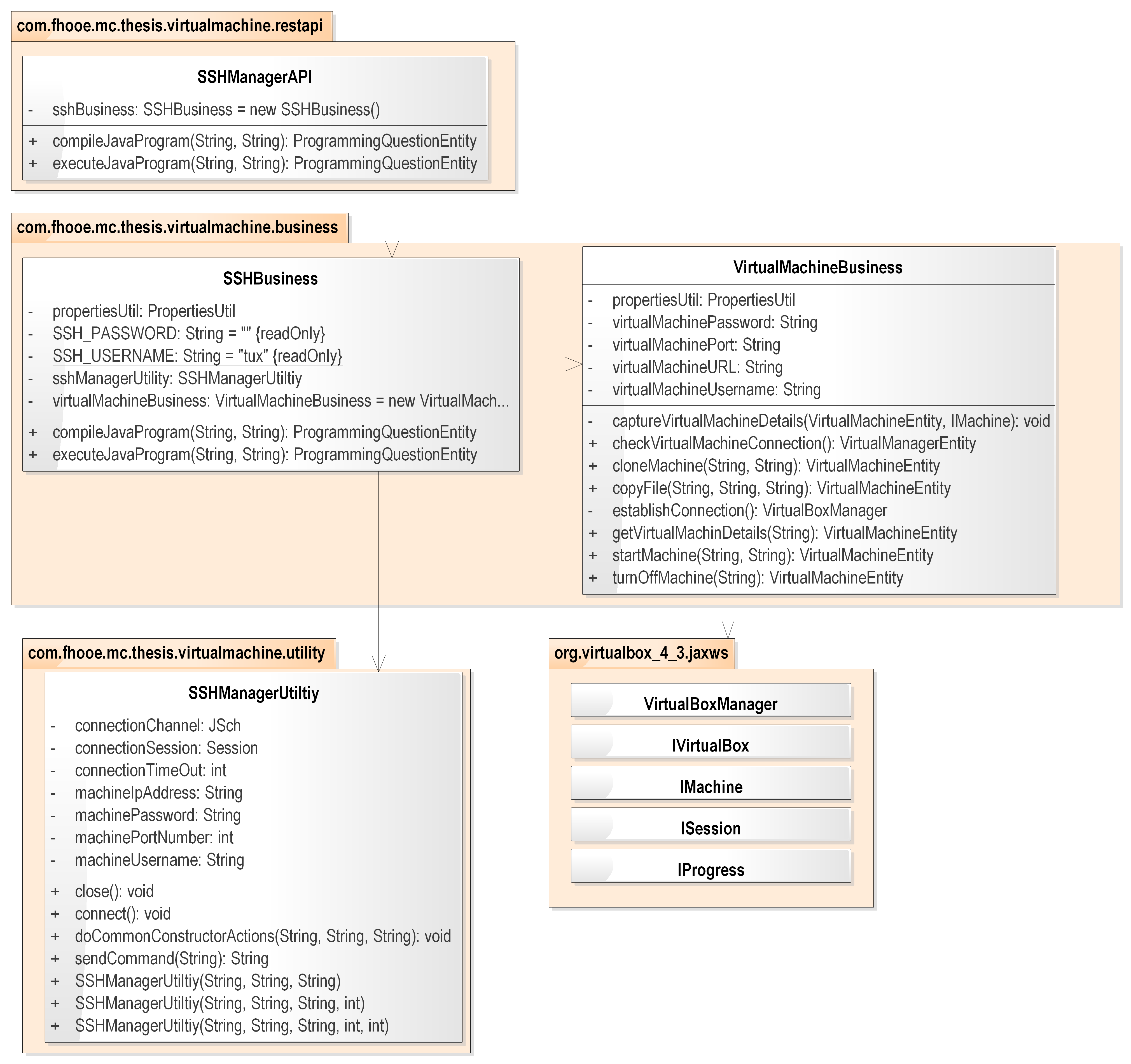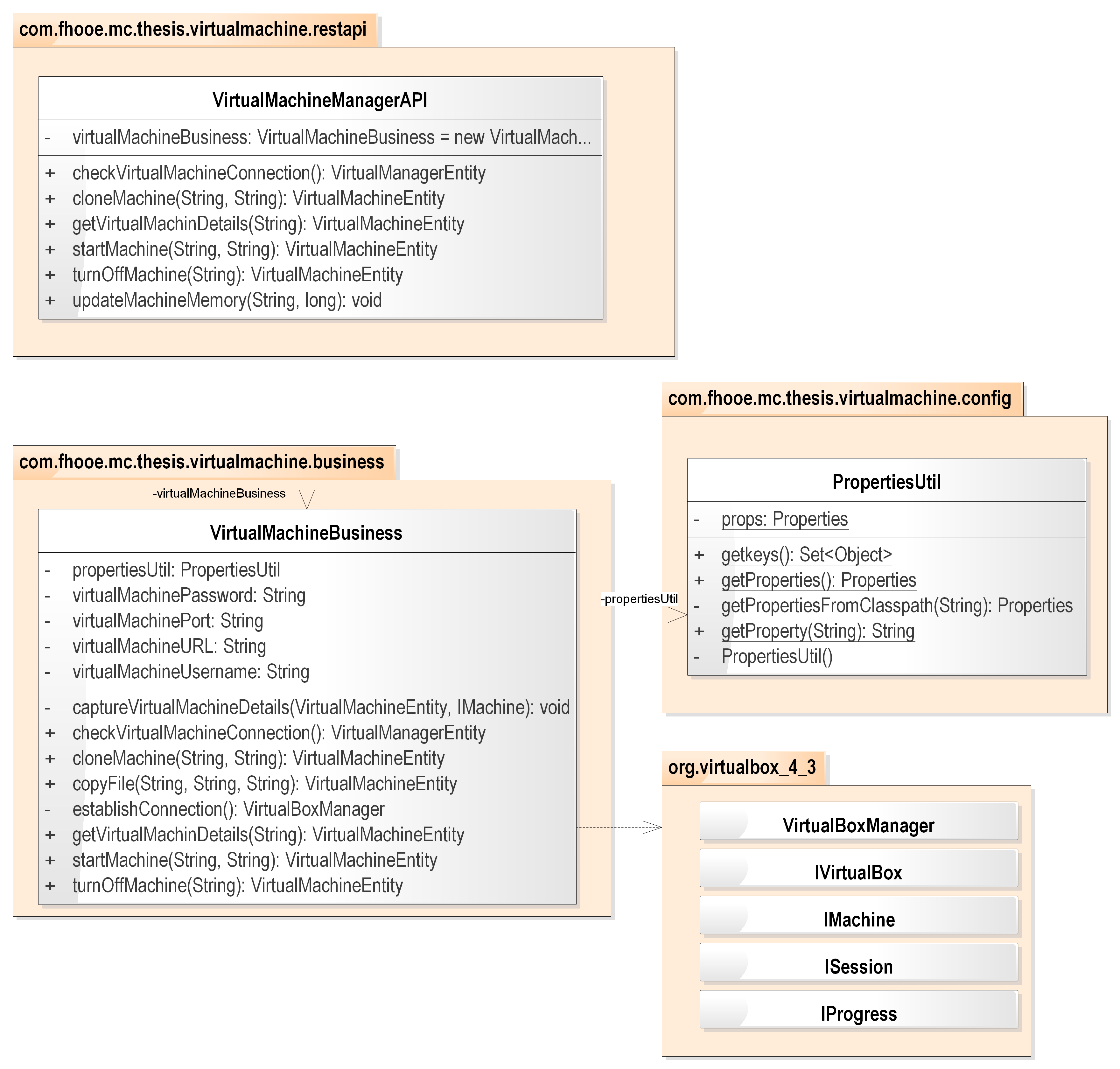 VM Management Component class diagram — the restapi package (Jersey endpoints) delegates to the business package which accesses IMachine and ISession interfaces from the VBox SDK for remote VM control